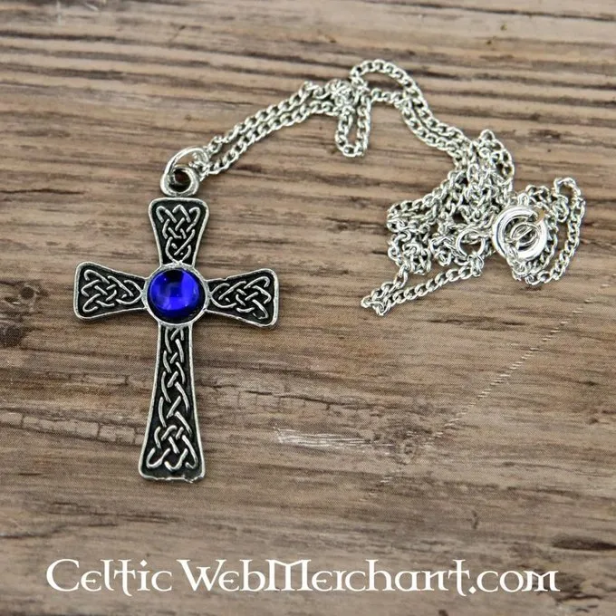 Denne pendant er inspireret af middelalderens keltiske kors. Det er dækket i detailled knotwork og har et blåt glas speeches. Den er lavet af tin og leveres inklusive sølv halskæde.