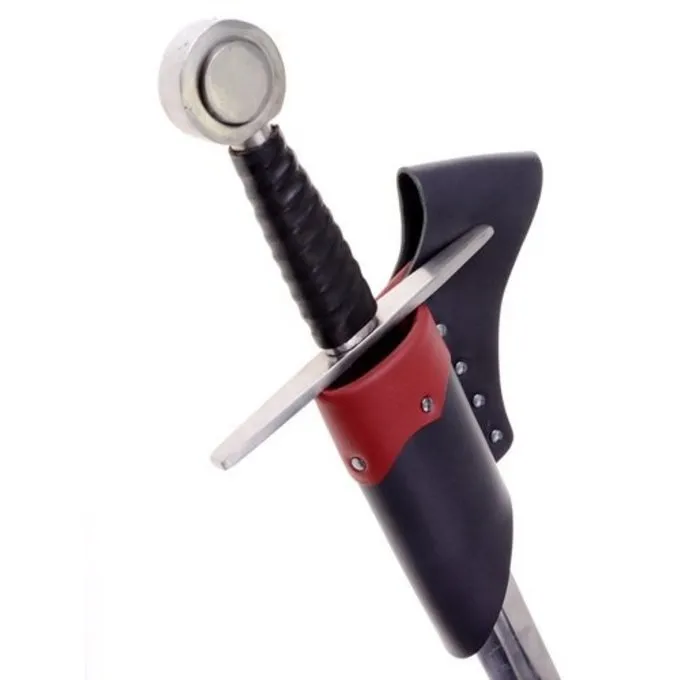 Denne læder sværd Holderen er lavet af nappalæder. Indehaveren sværdet er egnet til LARP sværd op til en diameter på 6 cm. Du kan hænge holderen på dit bælte, så du hurtigt kan trække dit sværd i løbet larp kampe.