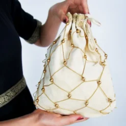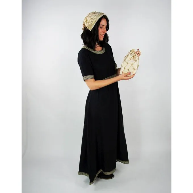 Dette luksuriøse pose kan bruges til Middelalder- og Renæssancearkæologi re-enactment. Det fuldender en adelsdame, en aristokratisk eller kongelig outfit. Den fløjlsagtig struktur i posen er dekoreret med et mønster af imiteret guld tråd og imitationer af naturperler. Det er fuldbragt af den smukt dekorerede øverste kant, der ligner en luksuriøs gobelin
