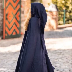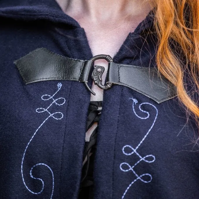 Denne Uldmix kappe har smukke broderede dekorative Kanter og er velegnet til re-enactment og LARP. Den tunge stof er let vandafvisende og varmt i vintermånederne. Den kappe kan fastgøres med en smuk spiral formet fibula med dragen hoved.