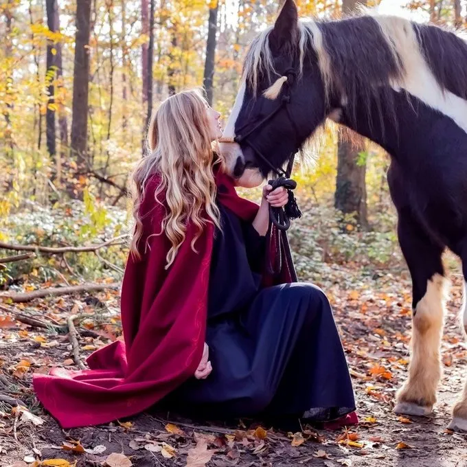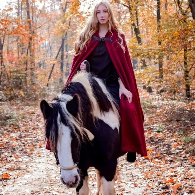 Denne Uldmix kappe har smukke broderede dekorative Kanter og er velegnet til re-enactment og LARP. Den tunge stof er let vandafvisende og varmt i vintermånederne. Den kappe kan fastgøres med en smuk spiral formet fibula med dragen hoved.