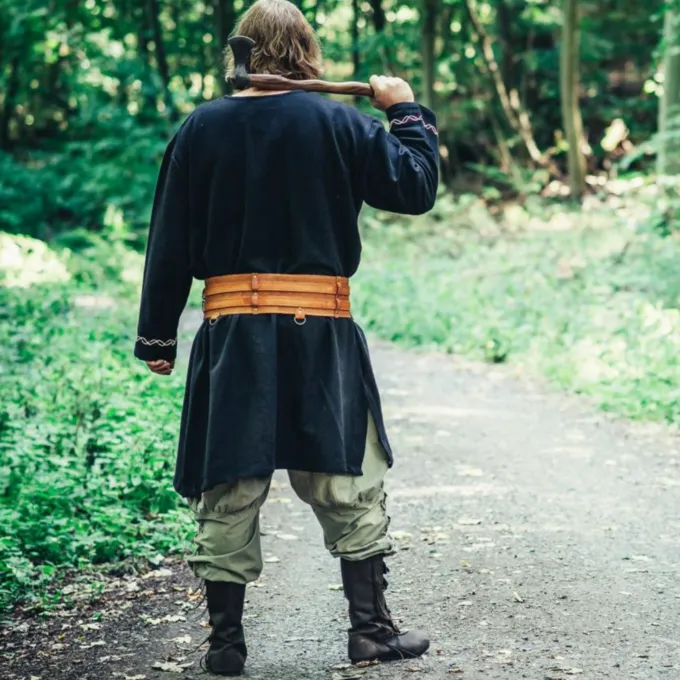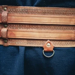 Dette bælte består af to bånd på ca.. 2,5 cm brede, der er bundet til en 11,5 cm bred stykke læder. Hele overfladen er dekoreret med en smuk keltisk knude motiv. Bæltet har flere ringe til at hænge ting som poser, bestik, knive osv Et fantastisk tilbehør til at fuldføre nyopførelse eller LARP kostume. Dette bælte er velegnet til både mænd og kvinder, det er tilgængeligt i forskellige længder.