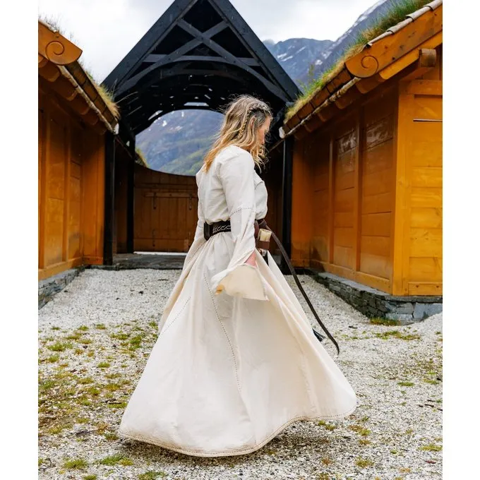 Denne middelalderlige kjole har imponerende brede ærmer. Traditionelt var dette et tegn på rigdom. Denne kjole er ideel til et sent middelalderligt eller naturligt fantasy -tøj. Det kan kombineres godt med overkjoler og med forskellige tekstiler og læderbælter. På det næste middelalderlige marked er du godt klædt med det enkle, men slående smukke broderi på kjolen!