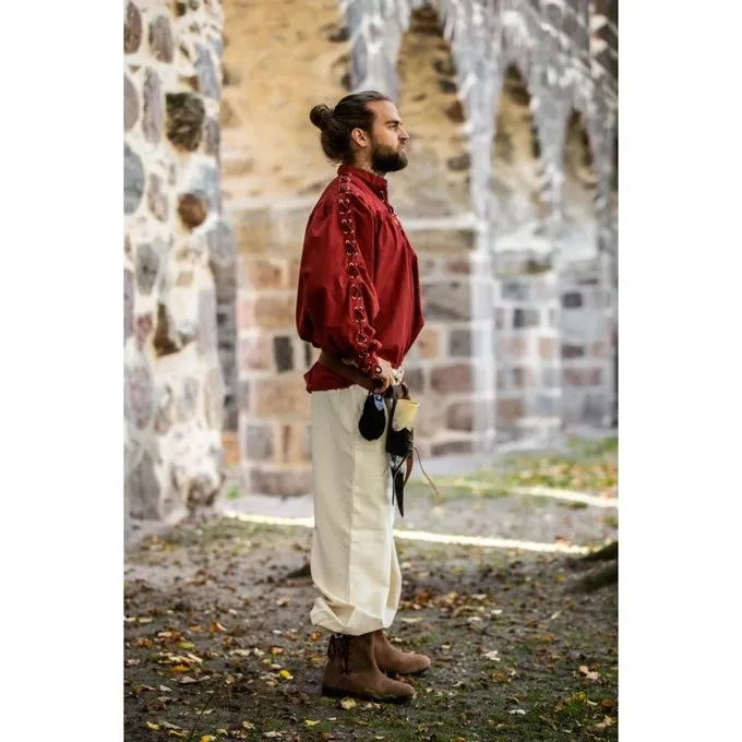 Denne smarte skjorte er egnet til at bære separat eller under en dublet eller vest. Det har snorer for en autentisk udseende. Skjorten fås i farverne sort, rød, brun og grøn.