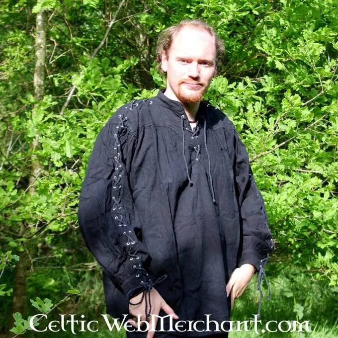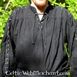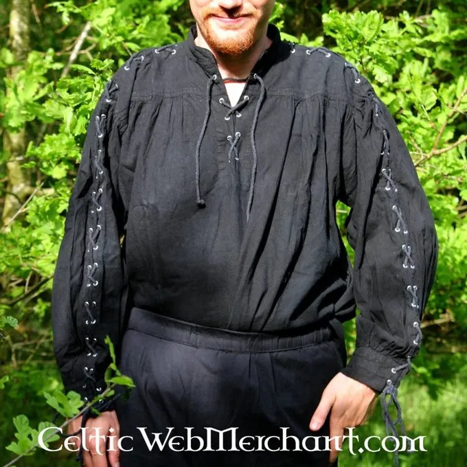 Denne smarte skjorte er egnet til at bære separat eller under en dublet eller vest. Det har snorer for en autentisk udseende. Skjorten fås i farverne sort, rød, brun og grøn.