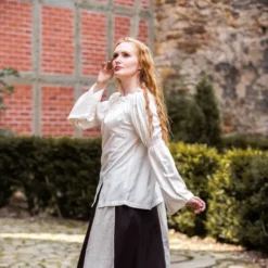De ærmer og hals af denne bluse er foret med elastik, så blusen kan bæres med bare skuldre. Blusen fås i størrelserne S til XXL i farverne brun, rød, sort, hvid og creme. Den brune og creme-version er lavet af bomuld mix, er de andre farver lavet af viskose