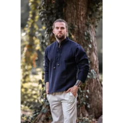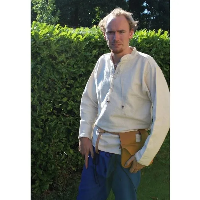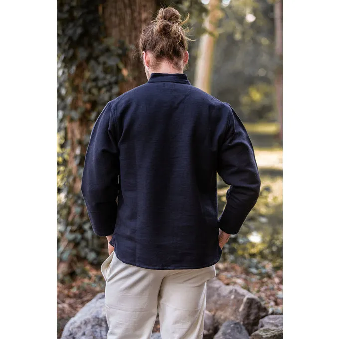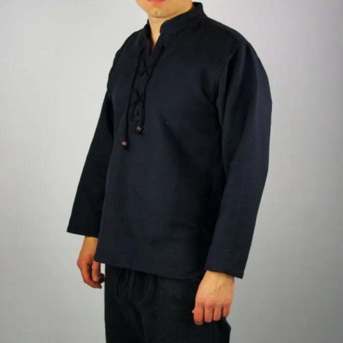 Denne trøje er lavet af tykt håndvævet bomuld. Det kan være sømmet op på halsen med en snor. Den fås i farverne creme, sort og grå i størrelse S til XXXL.