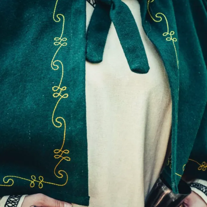 Den chaperon er en middelalderlig hovedbeklædning, der blev primært båret af de lavere klasser i samfundet under den tidlige middelalder. Omkring slutningen af middelalderen, rigere folk begyndte også at bære fashionable chaperons. Denne luksuriøse chaperon er lavet af en uld mix og beskytter dit hoved, nakke og skuldre mod vind, regn og kulde. En dejlig tilbehør til når du vil være genopførelse eller LARPing om vinteren eller bare på en kold dag. Den chaperon er smukt dekoreret på kanterne med broderede vin mønstre. Du kan fastgøre chaperon med de uldne ledninger, så det bliver på plads. Det har en lang spids hætte i middelalderens stil.