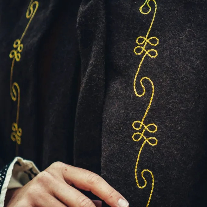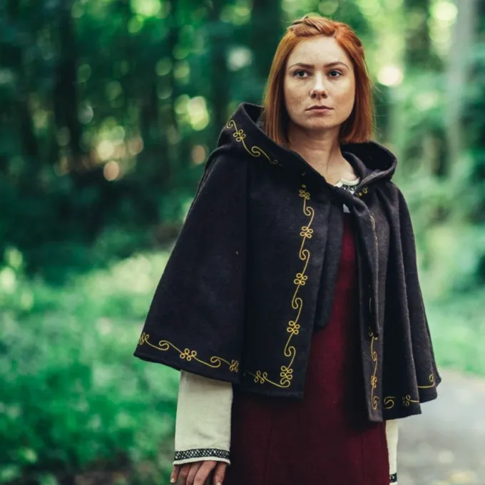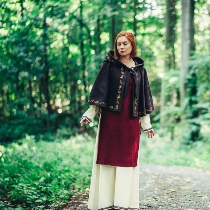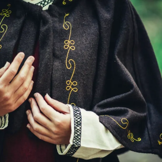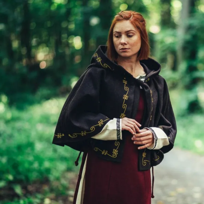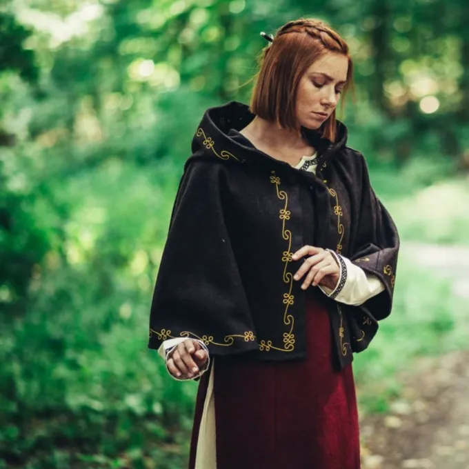 Den chaperon er en middelalderlig hovedbeklædning, der blev primært båret af de lavere klasser i samfundet under den tidlige middelalder. Omkring slutningen af middelalderen, rigere folk begyndte også at bære fashionable chaperons. Denne luksuriøse chaperon er lavet af en uld mix og beskytter dit hoved, nakke og skuldre mod vind, regn og kulde. En dejlig tilbehør til når du vil være genopførelse eller LARPing om vinteren eller bare på en kold dag. Den chaperon er smukt dekoreret på kanterne med broderede vin mønstre. Du kan fastgøre chaperon med de uldne ledninger, så det bliver på plads. Det har en lang spids hætte i middelalderens stil.
