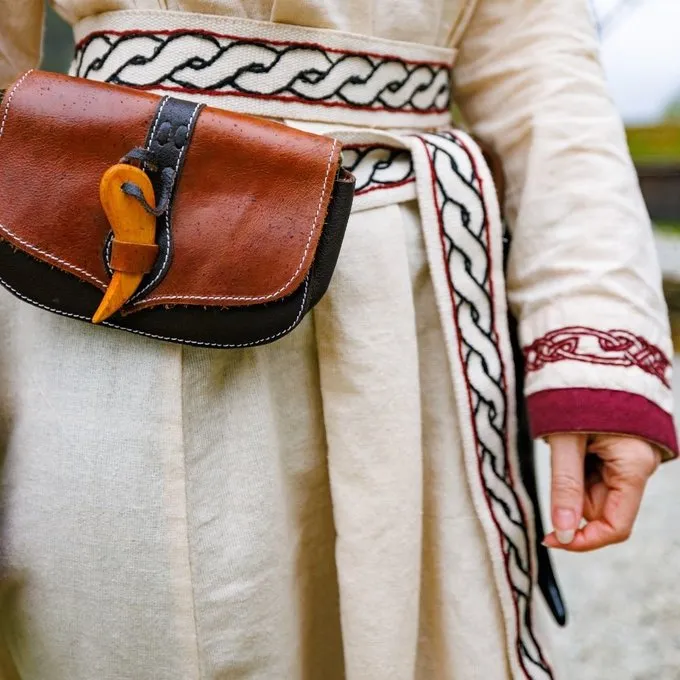 Dette tekstilvikingbælte går godt med ethvert vikingemændene og kvinder. Bæltet har broderi i form af et knude -motiv. Dette luksuriøse bælte er også egnet til at bruge til at hænge poser og tilbehør.