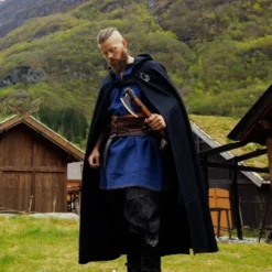 Denne vikingekappe gør det muligt at besøge arrangementer både sommer og vinter. Denne kappe er broderet med den mytologiske vikingeulv Fenrir. Frakken har hætte, den er vandafvisende og kan spændes foran med en lædersnøre.