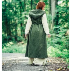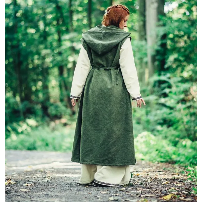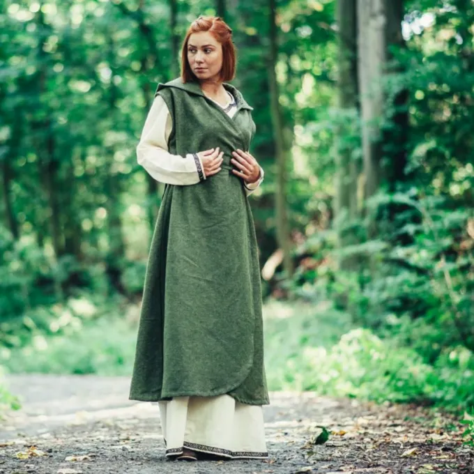 Du kan bære denne wrap-kjole over en anden kjole, eller bare separat. Du kan fastgøre det sikkert med bomuldssnoren. Kjolen har en hætte, der beskytter dit hoved, når det regner eller når det er koldt. En god tilføjelse til dit fantasy, LARP eller Cosplay outfit.