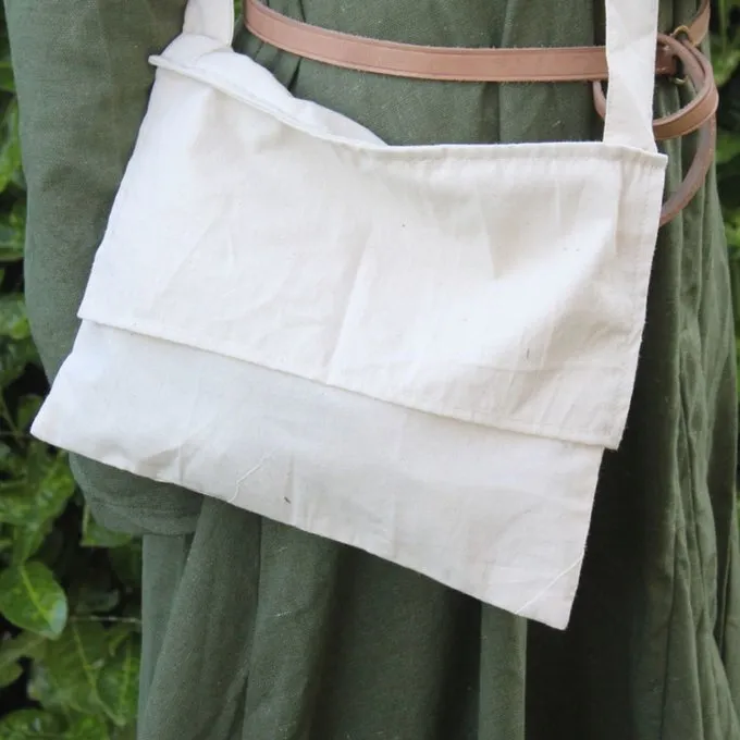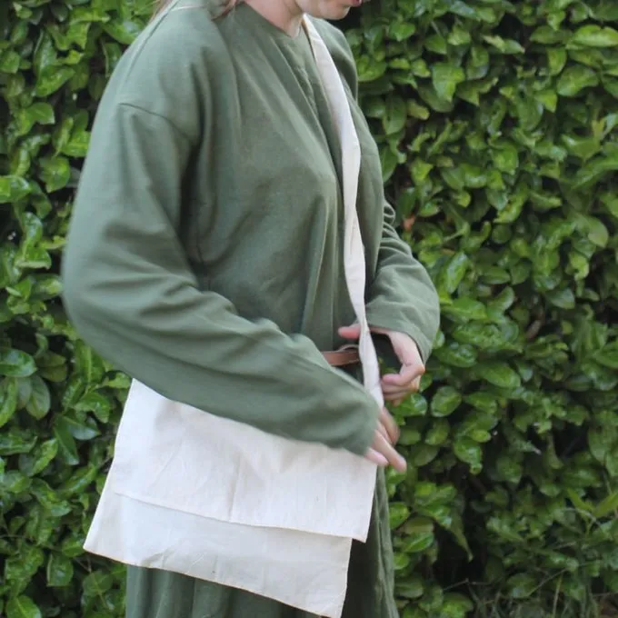 Denne taske er en kopi af en pilgrimspose, der er afbildet i katedralen i Valencia, Spanien. Den er lavet af lærred bomuld og det måler 28 x 31,5 cm.