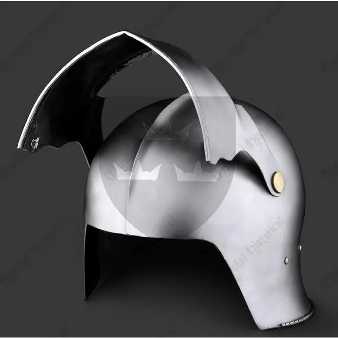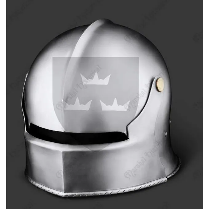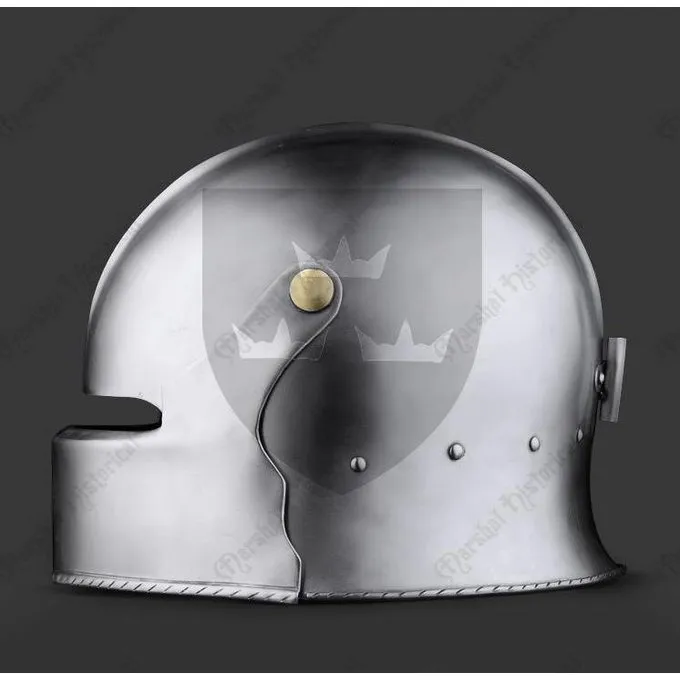 Denne sallet er en kopi af sydtyske og schweiziske originaler. Den er lavet i Augsburg-stilen og er typisk for sin korte nakkebeskyttelse. Visiret på denne praktiske sallet kan åbnes, og når det er lukket, kan det låses.