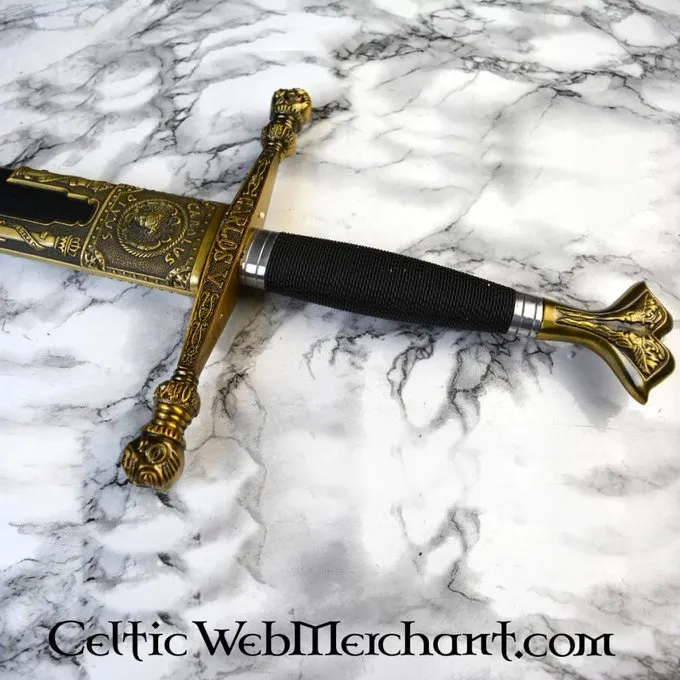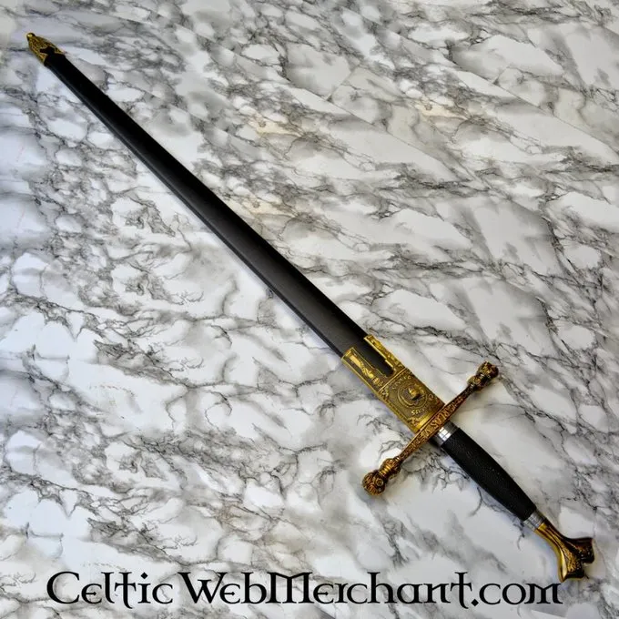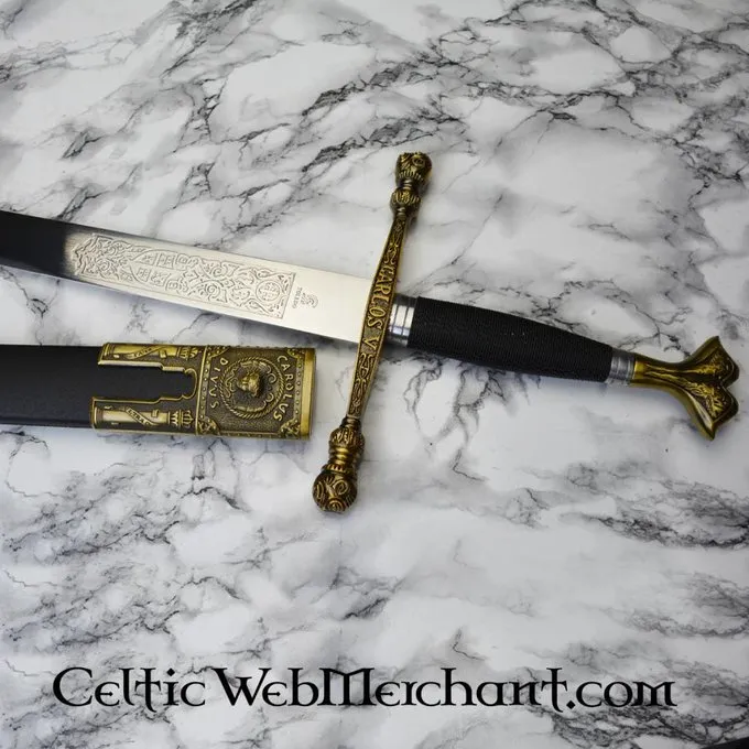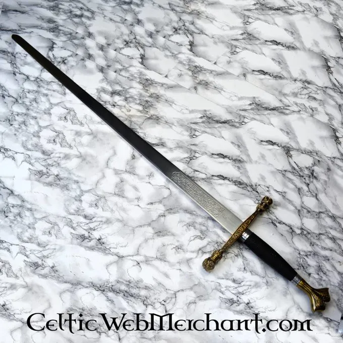 Dette er en smukt dekoreret sværd med en indgraveret blad, Knap og cross-vagt. Grebet er færdig med messing detaljer. Klingen er lavet af 420 kulstofstål med 0,4? 0,5% carbon, 12? 14% krom og en Rockwell hårdhed på HRC 54. Længden af sværdet er 102 cm, og det leveres herunder en skede.