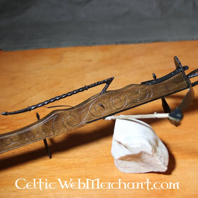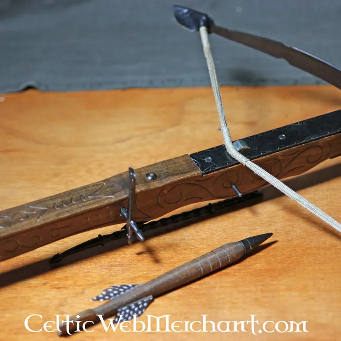 Længden af denne dekorative armbrøst er 62 cm. Den er forsynet med jernlemmer. Pilen medfølger.