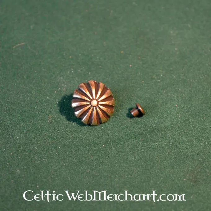 Denne bæltedekoration er solgt pr sæt 5 stk. Den er lavet af messing eller forsølvet messing og har en diameter på 1,8 cm