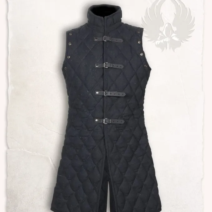 Denne ærmeløs Gambeson findes er ideel til at skabe en LARP eller reenactment karakter. Den Gambeson findes har læderremme ved fronten, der er lukket med spænder. Uden på dette Gambeson findes er lavet af uslebne vævet bomuld lærred. Det har en polyester polstring. På armene, dette Gambeson findes har blonder huller til fastgørelse af matching Arthur Gambeson findes arme eller rustning dele.