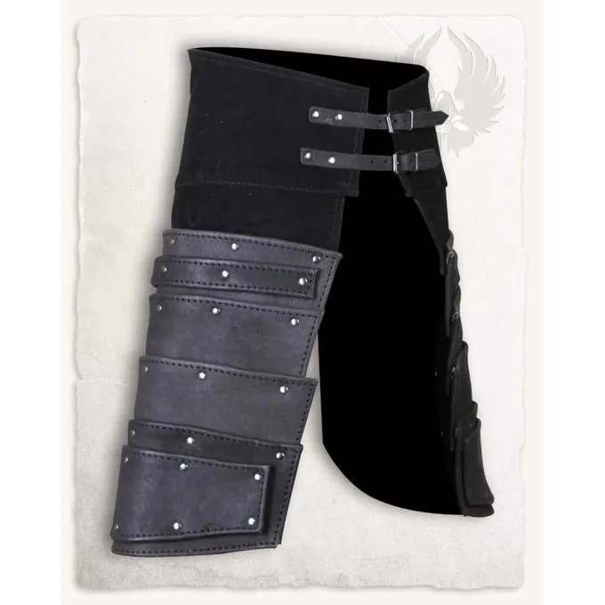 Dette produkt er velegnet til genindførelse, LARP og cosplay. Disse kvaster er lavet af øvre læder og ruskind. Du kan lukke denne rustning med to stropper, hvilket gør den ekstra robust. Designet af disse kvaster gør det meget fleksibelt, og det kurver pænt omkring bærerens hofter.