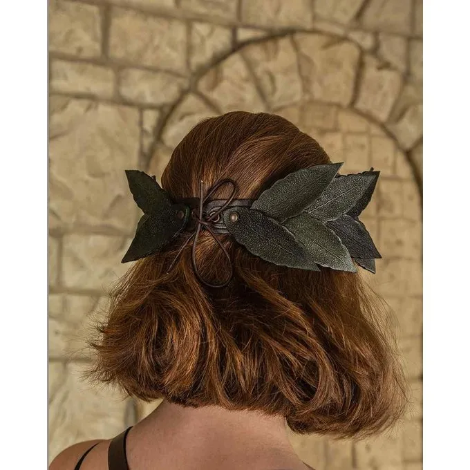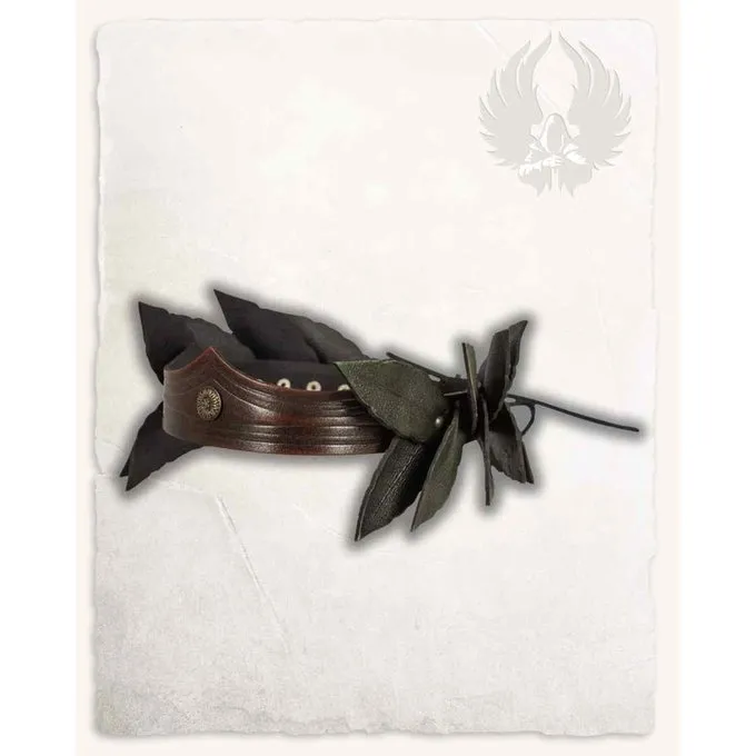 Denne laurbærkrans er håndlavet fra hærdet kohud læder øvre. Det minder om Cæsars gyldne laurbærkrans og er især velegnet til at skildre personer med højere rang. Begge måder at bære er mulige med punktet op eller ned. Det er snøret med en læderrem og passer til hver hovedstørrelse.