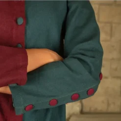 Denne kjole er egnet til reenactment, cosplay og LARP. Kjolen er lavet af lærred. Kjolen kan lukkes med rækken af knapper på fronten. Fordi kjolen er to-farvet, det skiller sig ud godt og giver brugeren et elegant look. Perfekt til senmiddelalderlige kostumer.
