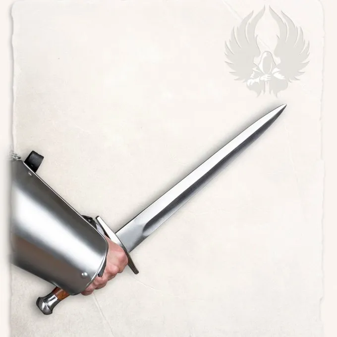 Denne semi skarp dolk er baseret på eksempler fra den sene middelalder. Det har et træ greb, med messing søm. Den dolk leveres inklusive læder skede.