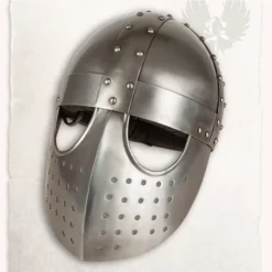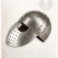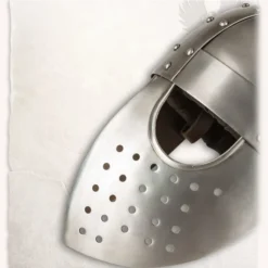 Denne middelalderlige hjelm er baseret på historiske originaler båret af riddere under det første korstog. Medieval hjelme som denne regelmæssigt afbildet på monumenter ligesom i kirker. Det tilbudt mere beskyttelse til ansigtet end den nasale hjelm. Great for middelalderlige kostumer og LARP.