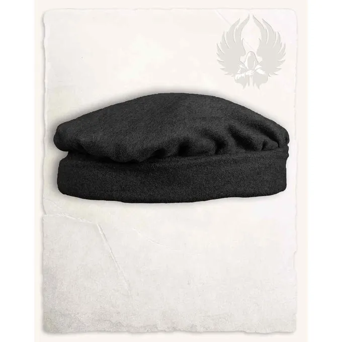 Stof: (70% uld, 20% polyester, 10% viskose) / Størrelse: S (58 cm), M 60 cm), L (62 cm) / Højde: 23 cm / Farve: sort / Baseret på en historisk original