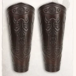 Disse Vambraces er egnede til Viking Reenactment, Cosplay og Larp. Dette produkt er lavet af læder af høj kvalitet. VAMBRACES er dekoreret med Thors Hammers og andre billeder baseret på norske mytologi. Dette gør disse Vambraces især perfekt til Vikinged kostumer. VAMBRACES kan lukkes med en snøring.