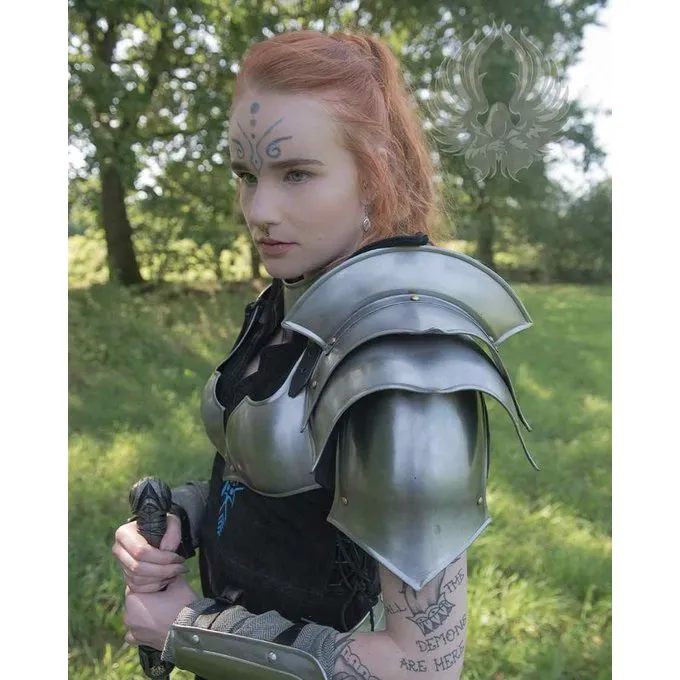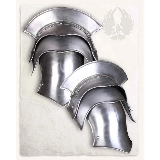 Dette produkt er velegnet til cosplay, larp og fotoshoots. Denne skulderrustning er lavet af 1,22 mm stål. Skulderrustningen har klingebrydere. Disse sikrer, at bæreren forekommer bredere og dermed også giver bæreren et heroisk look.