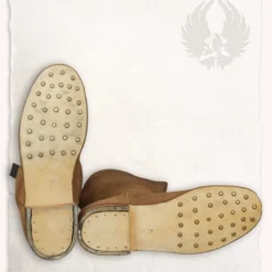 Disse Mytholon støvler er fantastisk til larp og periode stil kostumer. Fra gammel tid på, blev sko ofte dekoreret med sko negle. Dette forstærkede sålen og holdes folk i at glide på lædersåler. Disse støvler har en smuk hæl og resten af sålen har sko negle. Området omkring hælen er forstærket med stål. Støvlerne er lavet af blødt, men stærkt ruskind.