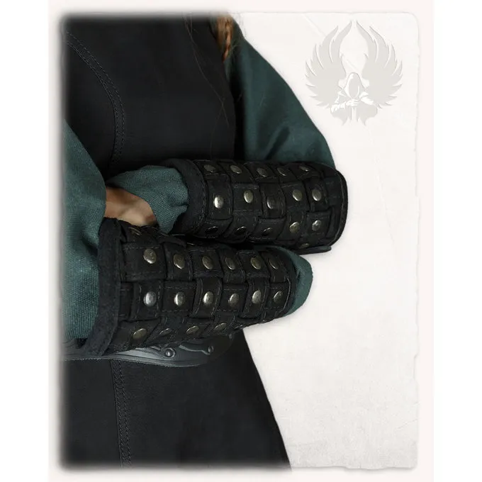 Disse Vambraces er egnede til reenactment, cosplay og larp. Vambraces er lavet af suede læder, hvilket gør dem ekstra behagelige. Vambraces består af flettet læderremme, som er nittet sammen. De kan lukkes med to bælte spænder.