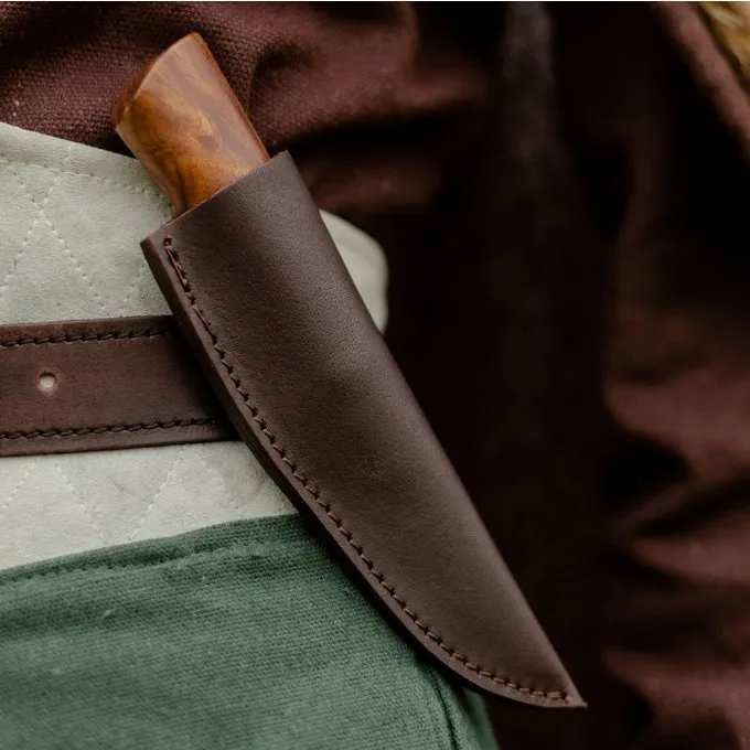 Materiale: Kulstofstål 50 HRC, træ, læder / Længde: 21,8 cm / Blade længde: 10,5 cm / Blade bredde: 3 cm / Kant: skarp / Vægt: 150 g. / Herunder læderskede / Baseret på en historisk original