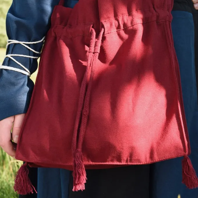 Denne skuldertaske er baseret på billeder i middelalderen illuminerede manuskripter og blyindfattede ruder. Skuldertasker var en almindelig type pose i løbet af middelalderen og var et godt alternativ til de mindre poser eller bælte poser. Folk kunne gemme flere ting i skuldertasker, dette var især nyttigt, hvis nogen gik på en lang rejse, såsom en pilgrimsrejse. Selv i hverdagen det var til tider nyttigt at bære en større taske, for eksempel landmænd tog mad med dem, når de gik på arbejde på landet. Pilgrimme dekoreret deres tasker med pilgrim badges. Denne taske er lavet af robust bomuld og perfekt til middelalder re-enactment, larp og Cosplay. Den 6 cm bred rem er dekoreret med en smuk fletning mønster. Tasken har også tre dekorative kvaster i bunden.