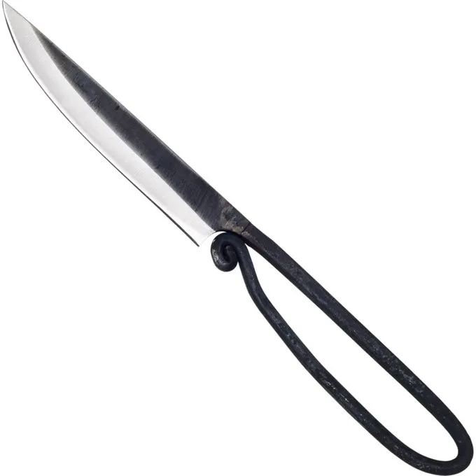 Knive som dette blev brugt fra jernalderen til slutningen af middelalderen til alle former for praktiske formål. Såsom at skære mad, læder, pels, voks, planter og lignende. Denne kniv er håndlaget af kulstofstål og har et meget autentisk traditionelt udseende. Dette gør den perfekt til historiske rekonstruktioner som kelter, angelsaxer, vikinger, frankere, normer, international gotisk mv. Kniven kommer med en brun læderkappe, hvor du kan gemme den.