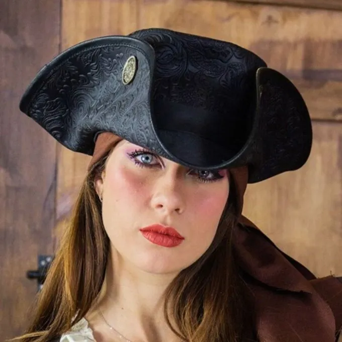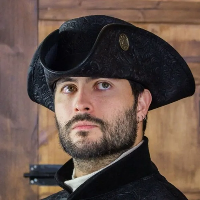 Hatte fra den spanske producent Rawblade er lavet af læder af høj kvalitet. Traditionelt håndværk og standarder af højeste kvalitet garanterer en lang levetid og dimensionel stabilitet. En læderhat er en loyal ledsager i dårligt vejr og et vigtigt tilbehør til mange kostumer. De tre doubloons hat er et godt valg for karakterer som spåmænd, eventyrere og skurke. Det er et karakteristisk hovedbeklædning, der fortæller historier om mange en rejse og eventyr. Dette er Deluxe -versionen af de tre doubloons hat, med et udsmykket motiv, der dekorerer læderet. Læder er et naturligt produkt og kan absorbere farvestoffer på forskellige måder. Den faktiske skygge kan afvige fra billedet.