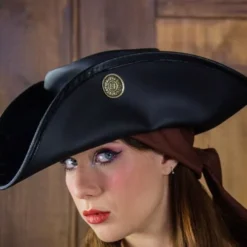 Hatte fra den spanske producent Rawblade er lavet af læder af høj kvalitet. Traditionelt håndværk og standarder af højeste kvalitet garanterer en lang levetid og dimensionel stabilitet. En læderhat er en loyal ledsager i dårligt vejr og et vigtigt tilbehør til mange kostumer. De tre doubloons hat er et godt valg for karakterer som spåmænd, eventyrere og skurke. Det er et karakteristisk hovedbeklædning, der fortæller historier om mange en rejse og eventyr. Læder er et naturligt produkt og kan absorbere farvestoffer på forskellige måder. Den faktiske skygge kan afvige fra billedet.