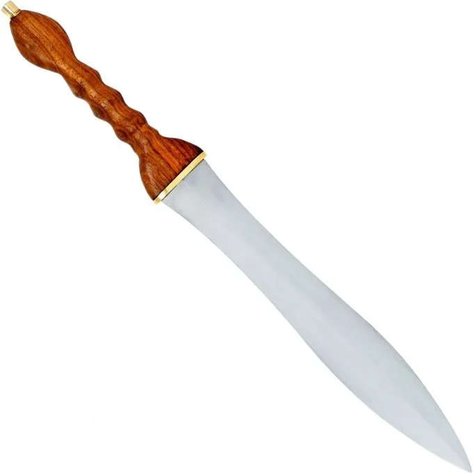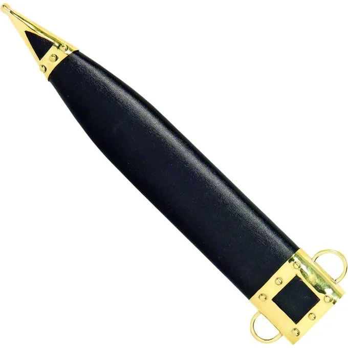 Denne kopi af en Puglia er lavet af kulstofstål og har en træ greb. Den pugio leveres med en sort læderskede med messingbeslag og ringe til at hænge den på båndet.