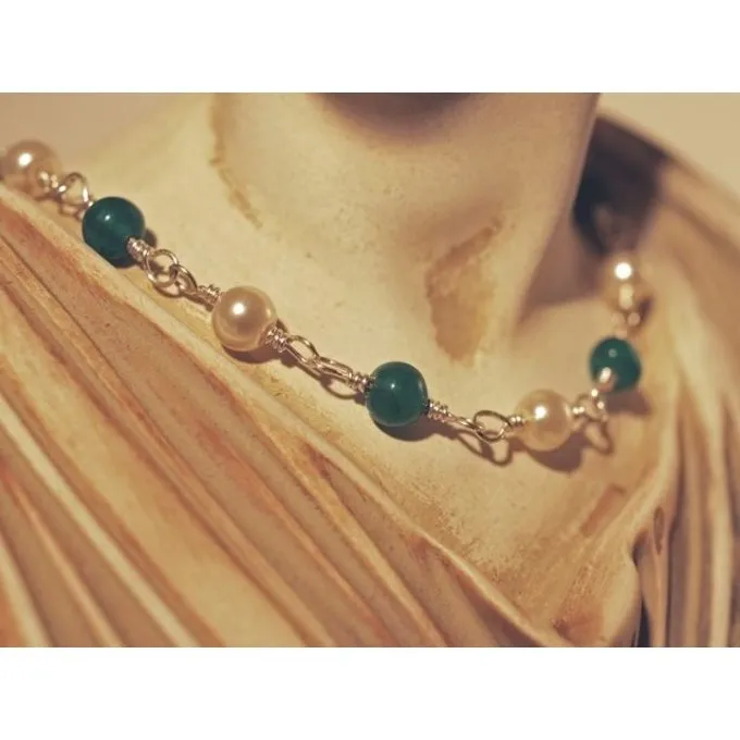 halskæde består af skiftevis turkis glasperler og ferskvandsperler. Halskæden selv er lavet af sterlingsølv.