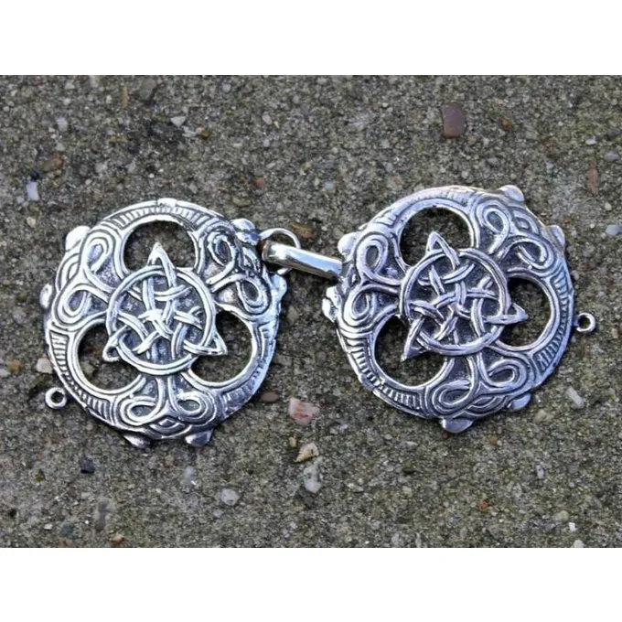 Denne sterlingsølv beklædningsgenstand lukning er lavet af to dele og er dekoreret med keltiske billeder. Det kan nemt være knyttet til stof. Hver del måler ca. 37 mm.