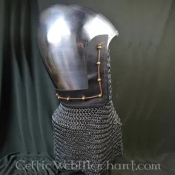 Detaljer / Materiale: kulstofstål 2 mm / Aventail Runde ringe fjederstål vævet 4-i-1 / articles: tekstil / Størrelse: M (64 cm) L (68 cm) / Vægt: 4,7 kg / Baseret på historisk original /