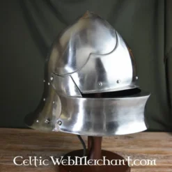 Denne hjelm er lavet af 2 mm tyk stål og er forsynet med en læder speeches. Visiret kan åbnes og hjelmen kan nemt kombineres med en bevor at beskytte halsen og hagen.