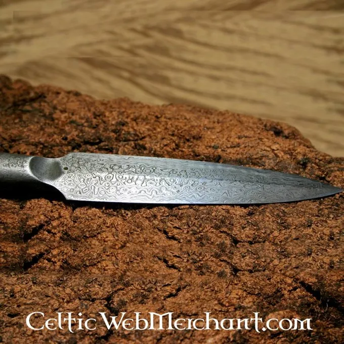 En masse tidlig middelalder spydhoveder var lavet af damaskusstål. Spidsen blev lavet af flere lag stål, der blev vævet sammen. Denne spydhoved er autentisk lavet. Det er en kopi af en 6. århundrede South germansk spydhoved, men lignende originaler forekom indtil det 10. århundrede.