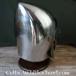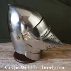 Denne kampklare bascinet er fremstillet af 2 mm tyk stål og har en justerbar læder speeches.