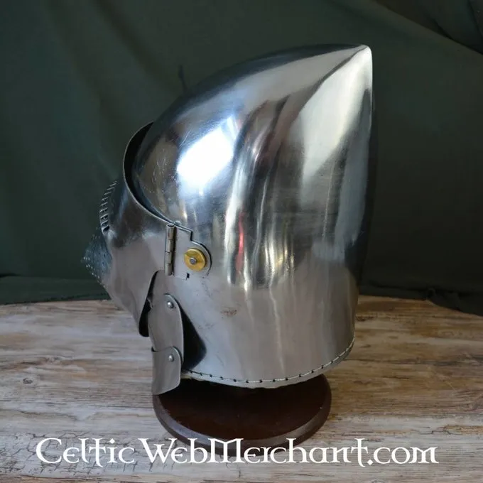 Denne middelalderlige bascinet er en kopi af en tidlig 15. slutningen af det 14. århundrede originalen. Bascinetter som dette blev båret over hele Europa i løbet af det 15. århundrede. denne bascinet blev oprindeligt fremstillet i Italien. Denne luksuriøse hounskull bascinet har en bevægelig beskyttelse hals. Visiret er tilspidset til at aflede slag. Denne bascinet kan let forsynes med en suspension til en brynjekrave.