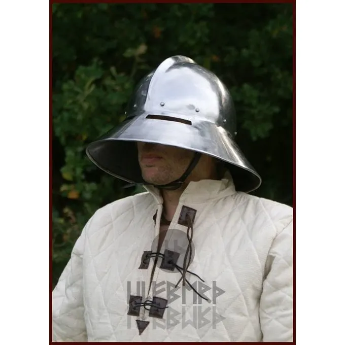 Denne kedelhat er en kopi af en slutningen af det 14. – tidlige 15. århundrede originalen. Kedelhatte ligesom dette blev båret hele Europa mellem det 14. og 15. århundrede. Denne kedelhat (også kaldet Kapalin hjelm) er en kombination af en salade og en kedelhat. Den Kant giver beskyttelse mod projektiler. Ud over dette hjelm beskytter ansigtet med et visir. Da der ikke var nogen fare, kunne hjelmen vippes til bagsiden af hovedet for at få et optimalt synsfelt. Denne kampklare hjelm er fremstillet af 2 mm tyk stål