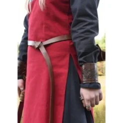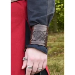 Disse brede Viking håndledsbeskyttere er lavet af høj kvalitet vegetabilsk garvet læder. Overfladen og kanter er poleret og har en lys farve finish, som giver læderet sin karakteristiske brugt look. Relieffet motiv af Jelling-stil drager stammer fra sølvbæger af den danske konge Gorm fra det 10. århundrede. Læder snørebånd til fastgørelse af håndledsbeskyttere er inkluderet. Perfekt til Viking kostumer, larp og bueskydning.