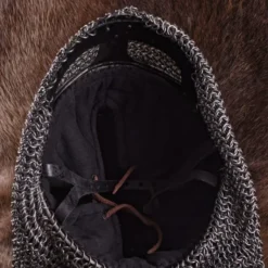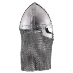 Denne Viking-brillehjelm med kædemail fra Vendel-perioden er 1,6 mm tyk og egnet til genindførelsesslag. Hjelme som denne blev båret mellem 550 og 1066 og er en smuk tidlig middelalderlig model baseret på en original fra Valsgarde, Sverige. Valsgarde var kun 3 km fra Gamla Uppsala, det svenske konges gamle centrum og den hedenske tro i Sverige. Hjelmen består af stålplader, der er fastgjort til hinanden med stålbånd eller Spangen. Hjelmen giver god beskyttelse af næsen, øjenbryn, hoved og hals. Availail består af skåret kædepost, og ringene har en diameter på 8 mm. Indersiden af hjelmen er foret med bomuldspolstring, som du kan justere til din størrelse. Du kan fastgøre hjelmen med læderhindestroppen.