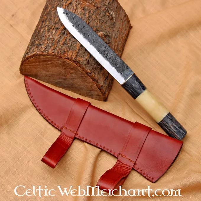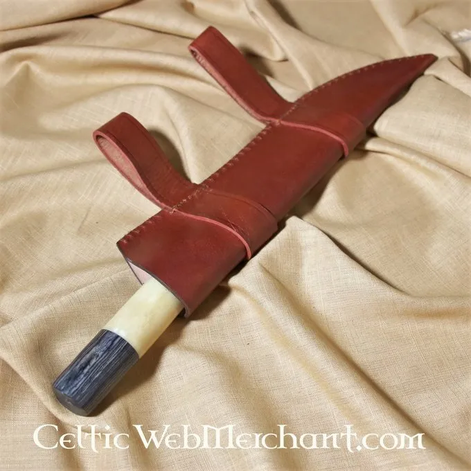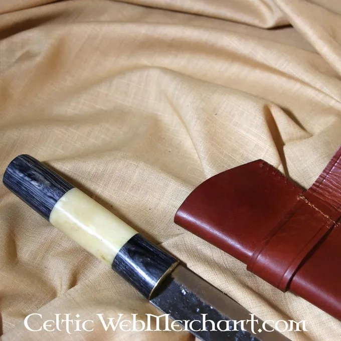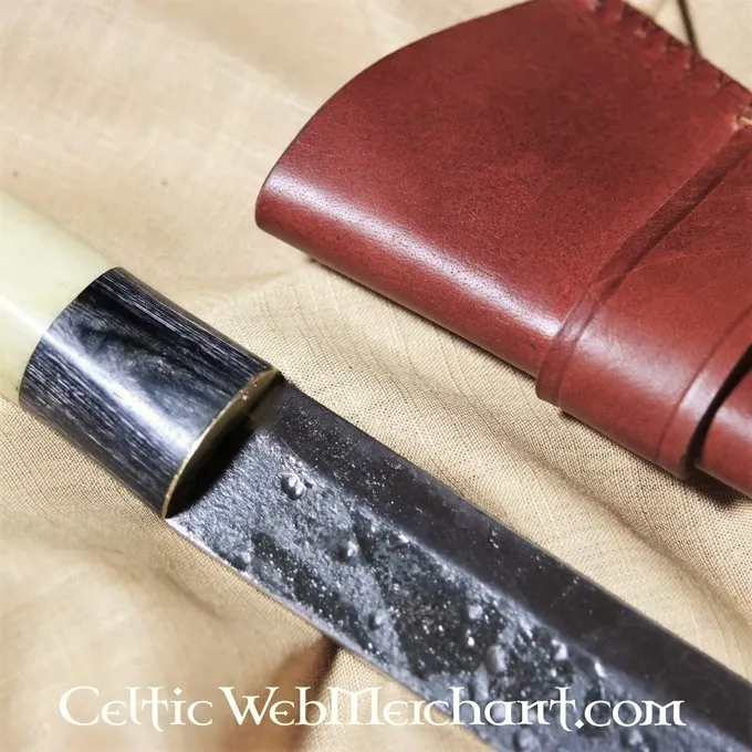 Denne seax ser smukt autentisk ud med håndforfalskede detaljer på bladet, hvor man kan se smedenes hammerblæser. Det har greb af træ og ben. Den leveres med en smuk brun læderkappe med flettede dekorationer og en håndbundet kant. I denne skede kan du hænge saxen på dit bælte.
