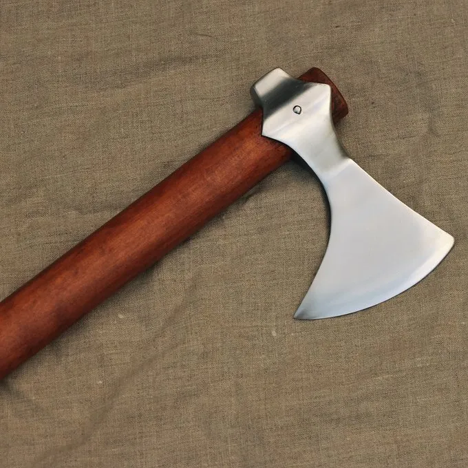 Denne danske økse af ankerspil Steelcrafts er baseret på Viking akser fra den tidlige middelalder. Den danske økse er en type af Viking økse og den eksisterede i flere størrelser. Mest almindeligt anvendte var en handy størrelse egnet til hugge brænde, men også for øksekast og nærkamp. Denne replika danske økse er af den mindre og multifunktionelle typen Viking økse. Denne semi-skarpe replika økse er lavet af hærdet 1065 carbonstål med en hårdhed på 48-52 HRC. Perfekt til Viking reenactment, vikinger eller Sidste Kingdom Cosplay eller som et dekorativt økse til din samling. Når du blunten det, det er egnet til reenactment slag, og hvis du gør det skarpe kan du bruge det til at hugge brænde.